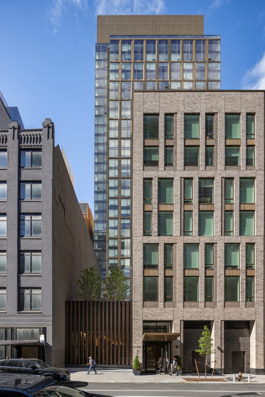 The Ellery is composed of both a high- and low-rise portion which connect via a collection of shared amenity spaces. Along West 42nd Street, a 32-story tower addresses the intensity of the block through torqued vertical metal banding, in a bronze finish, that moves up and around the tower. On quieter 43rd Street, a 7-story building relates to its neighbors in scale as well as through its gray brick façade and punched windows. Horizontal bronze banding here visually ties the two buildings together.