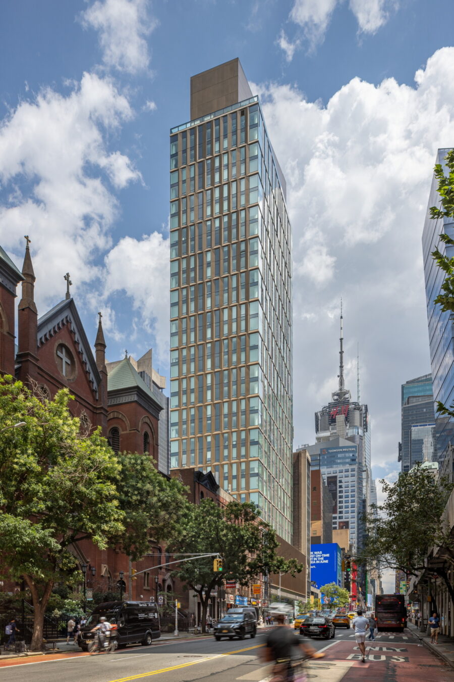 The Ellery is a 330-unit residential building located on a through-block site in Midtown Manhattan. The site effectively straddles two neighborhoods: the southern portion of the block fronts West 42nd Street and is part of the fabric of Times Square, while the West 43rd Street side is lined with historic brick buildings and is effectively part of Hell’s Kitchen. The design needed to respond appropriately to these two very different streetscapes, balancing the energy of 42nd Street with the quieter, low-rise character of 43rd Street.