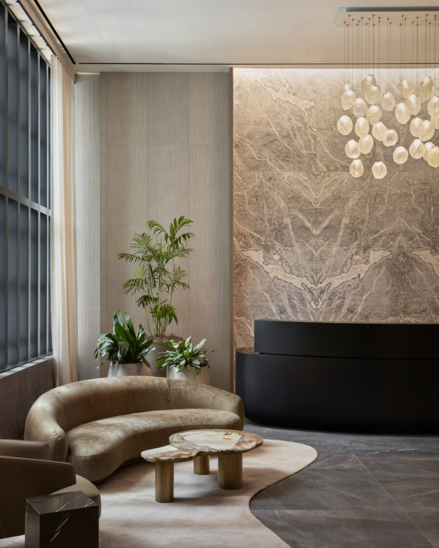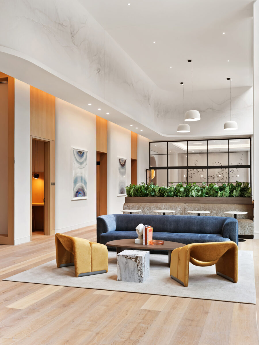 Interiors are designed to create a sophisticated reprieve from the noise outside, with a palette of rich natural materials and warm woods, and interior and exterior greenspaces integrated throughout.